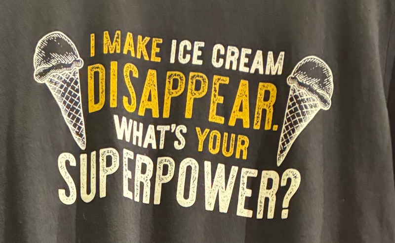 Inside the parlor, we treated ourselves to a banana split and the whimsically named Tortoise and Hare Sundae (no hares were harmed; it was a turtle-chocolate-brownie dream). We also snagged a couple of fun t-shirts: one that said “I can make ice cream disappear. What’s your superpower?”